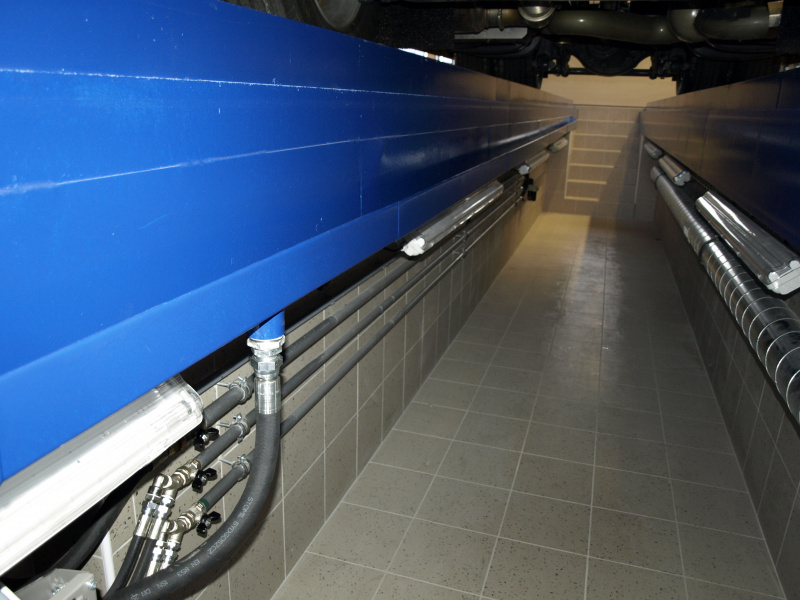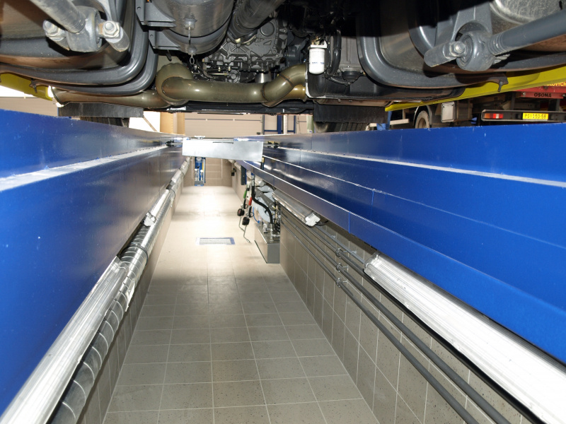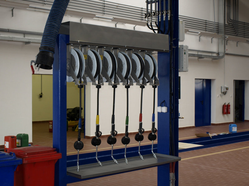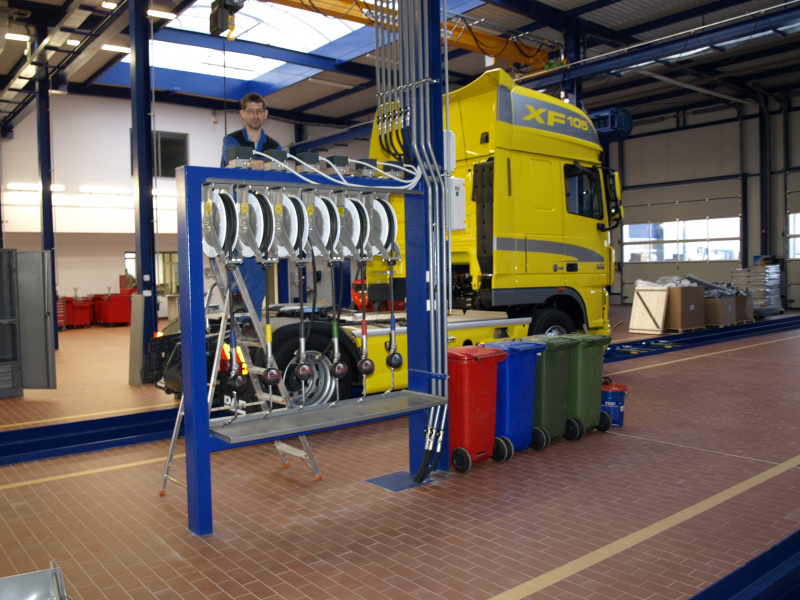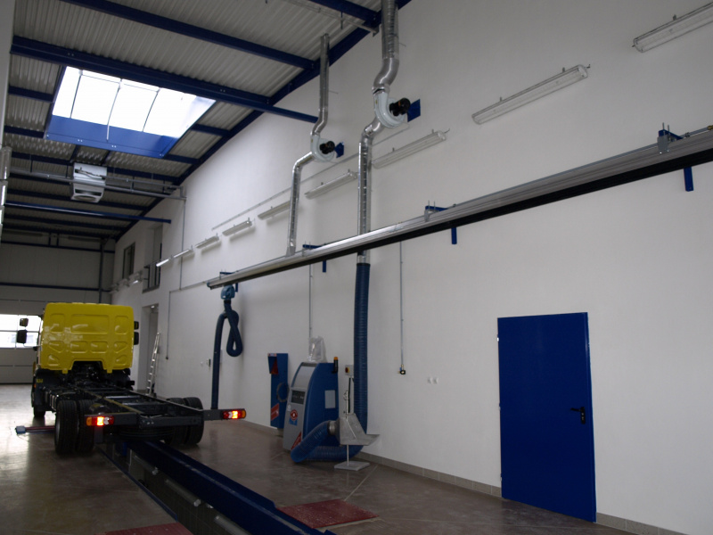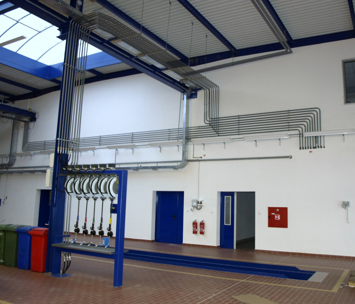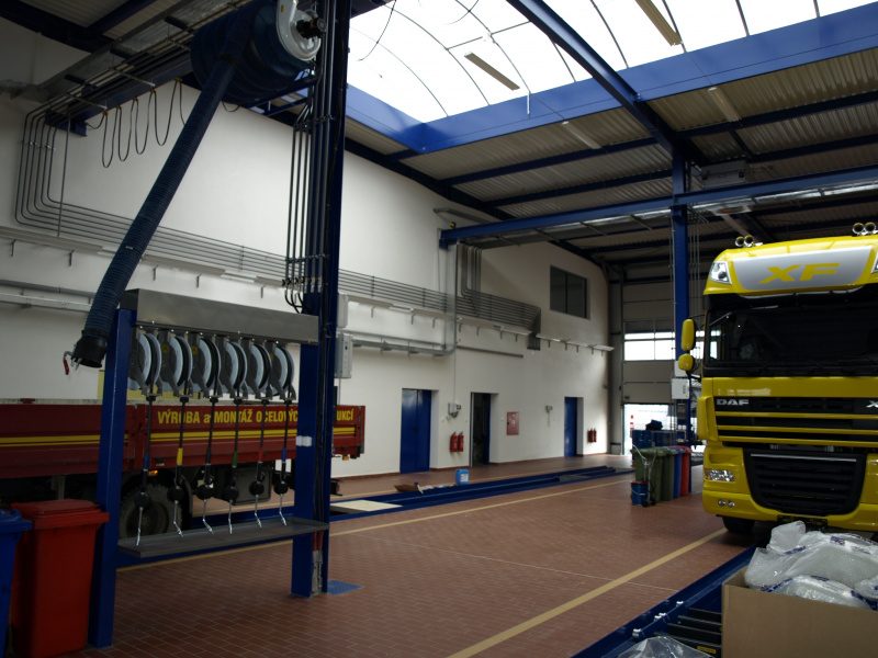 Olejové hospodárstvo pre servis nákladných automobilov DAF Nýřany. Realizácia výdaja nových olejov na výdajnom stojane a v montážnej jame. Odsávanie použitého oleja. Súčasťou dodávky je aj inštalácia odsávacej lišty výfukových splodín.